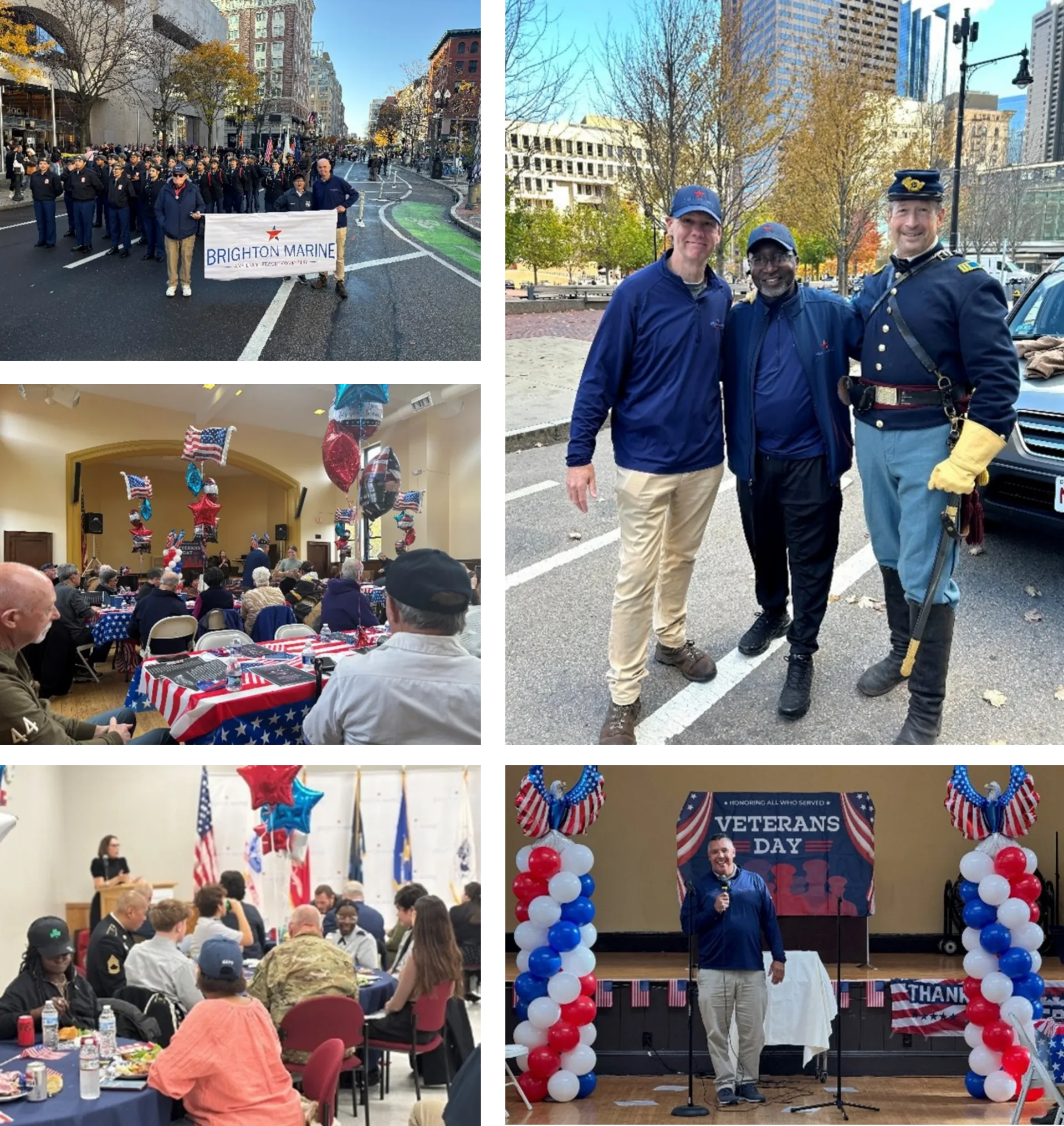 Our Veterans Day celebration spanned an entire week and reached across Boston and the Allston–Brighton community. The week began with Brighton Marine joining the Boston Veterans Day Parade downtown, again partnering with organizations such as Brighton Elks, Soldier On, and the East Boston JROTC. The team also visited Saint Columbkille Partnership School for its annual Veterans Day celebration, where students generously contributed to support Brighton Marine’s Veteran programs and services.